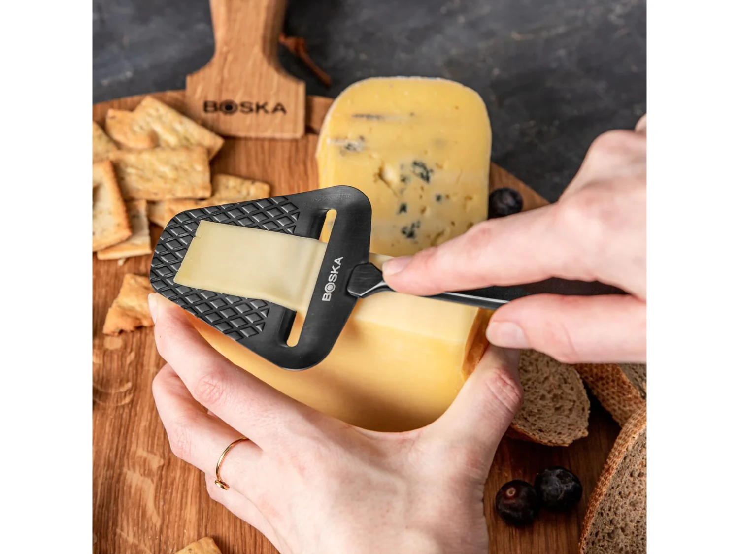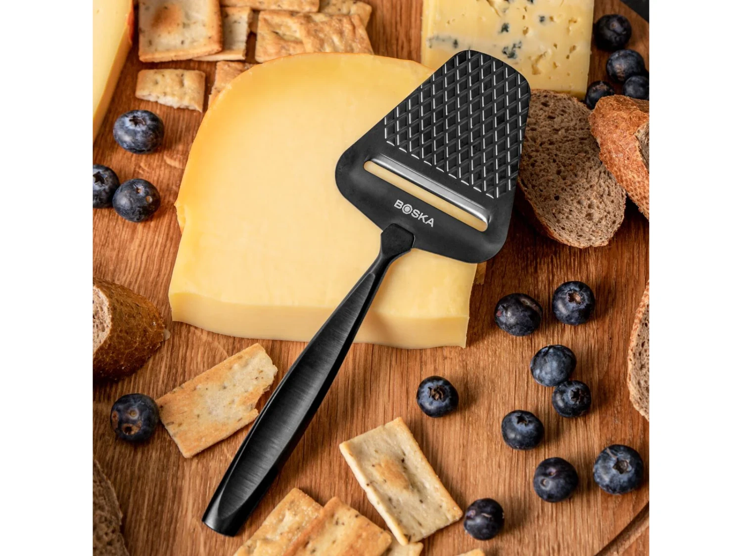 Naast alle tradionele kaasschaven, komt Boska nu ook met de mat zwarte editie. Deze Boska kaasschaaf Monaco is samengevoegd uit meer dan 120 jaar ervaring en heeft een industriële look. Door het gewafelde oppervlak met non-stick coating schaaf je heel makkelijk smaakvolle plakken, zonder dat de kaas blijft kleven. De schaaf is geschikt voor mooie, dunne plakken half harde en harde kaas. Denk daarbij bijvoorbeeld aan echt Hollandse Gouda. Na gebruik kan de kaasschaaf in de vaatwasser worden gereinigd. De kaasschaaf wordt bovendien geleverd in een mooie geschenkverpakking.