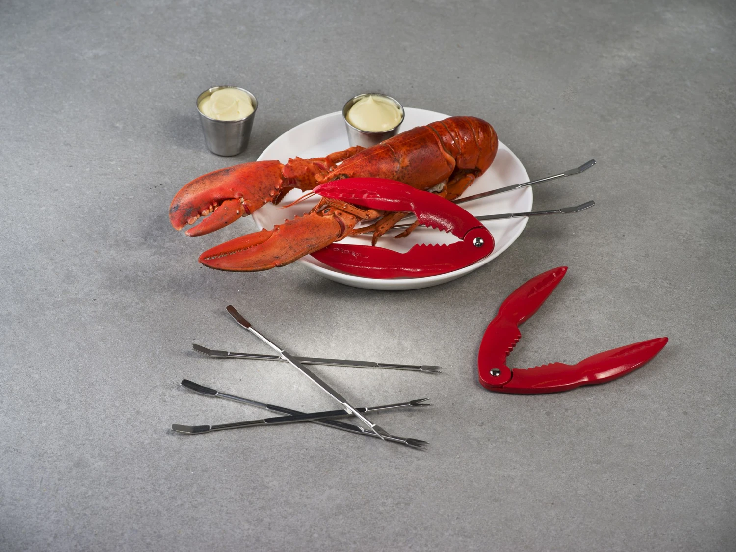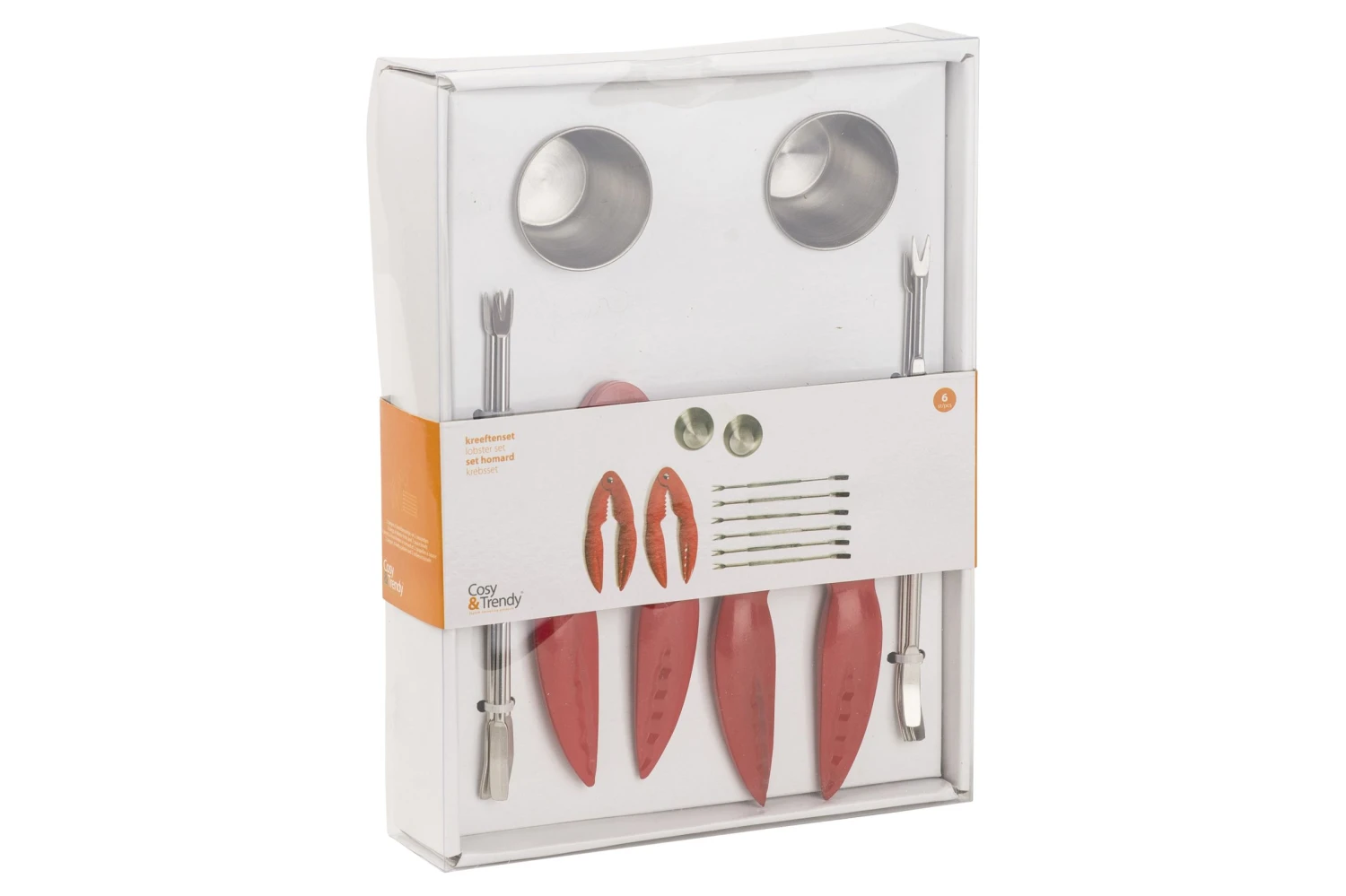 Dit is een handige set om de exclusieve smaak van kreeft op verfijnde wijze te proeven. De set bestaat uit 2 stevige tangen om de harde schaal van kreeft gemakkelijk te breken. 6 vorkjes waarmee u en uw tafelgezelschap op een elegante manier het vlees uit de kreeftenpoten kunnen halen. En 2 sauspotjes voor een torentje cocktailsaus bij gekookte kreeft of voor een remouladesaus wanneer u deze delicatesse grilt op de barbecue.