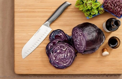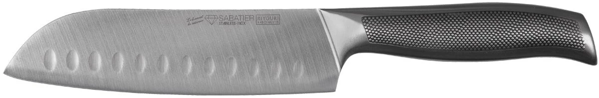 Ben jij ook zo gek op fijngesneden ui, knoflook en gember? Dit Japanse Santokumes van Diamant Sabatier is ideaal voor de fijnste snij klusjes in de keuken. Met het Santokumes kun je ook nog eens gemakkelijk jouw fijngesneden stukjes ui oppakken met het mes. In tegenstelling tot Europese koksmessen is het lemmet breder, dunner en niet zo spits. De kuiltjes in het lemmet zorgen ervoor dat etenswaren minder snel blijven kleven aan het mes.