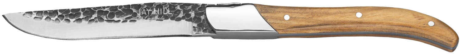 Jouw mals gebraden vlees perfect in plakjes snijden? Met deze Jay Hill steakmessen Laguiole olijfhout heb je een luxe set van 6 kwaliteits-steakmessen. Deze stijlvolle messen beschikken over een elegant handvat van olijfhout. Het lemmet is 11.3 cm lang en 2.5 mm dik. Door het scherpe snijvlak snijd je met gemak door jouw perfect gegaarde vlees. Wil je steakmessen cadeau geven aan familie of vrienden? Deze Jay Hill steakmessen Laguiole olijfhout worden geleverd in een luxe houten kist in een mooie geschenkverpakking.