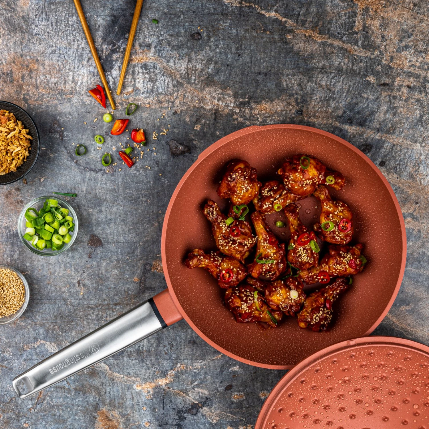 Deze wokpan van Westinghouse is perfect voor het wokken, bakken en braden van vlees, vis en groente. Maar ook voor fonduen en het maken van soepen. Dankzij de spikes onderaan de deksel blijft condens zich vormen waardoor er druppels ontstaan die je gerechten lekker sappig houden. Het roestvrijstalen handvat zorgt ervoor dat je niet je handen verbrand tijdens het verplaatsen van de pan.