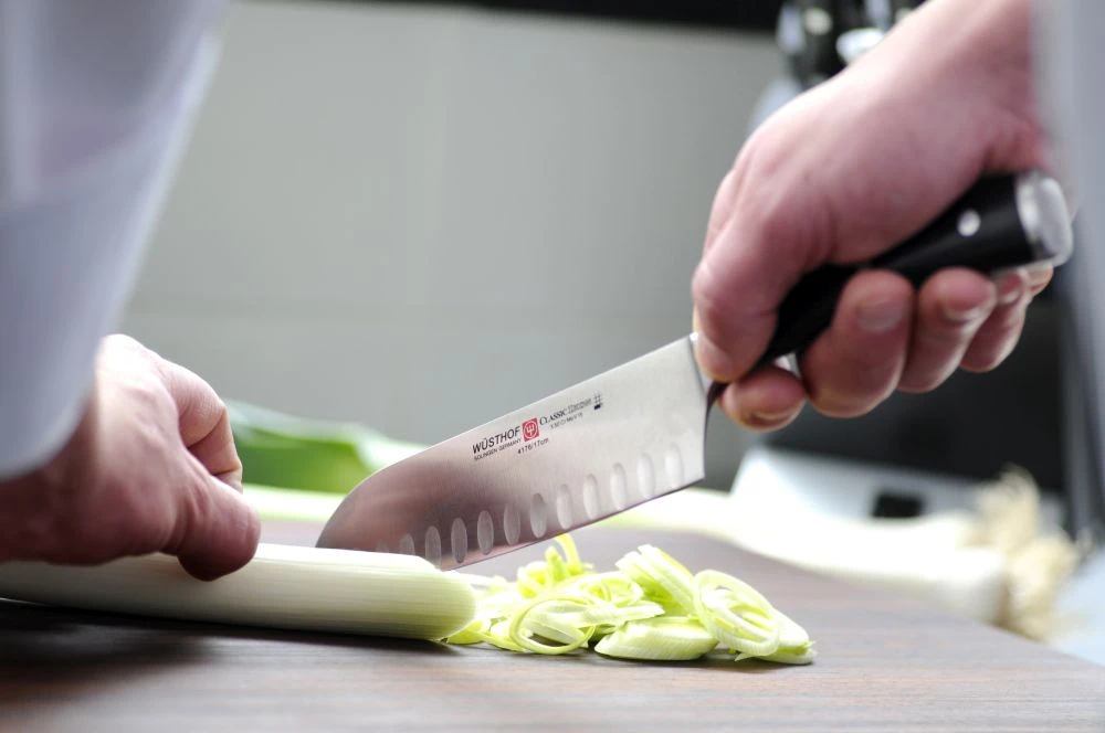 Ben jij ook zo gek op fijngesneden ui, knoflook en gember? Dit Japanse Santokumes is ideaal voor de fijnste snij klusjes in de keuken. Met het Santokumes kun je ook nog eens gemakkelijk jouw fijngesneden stukjes ui oppakken met het mes. In tegenstelling tot Europese koksmessen is het lemmet breder, dunner en niet zo spits. De kuiltjes in het lemmet zorgen ervoor dat etenswaren minder snel blijven kleven aan het mes.